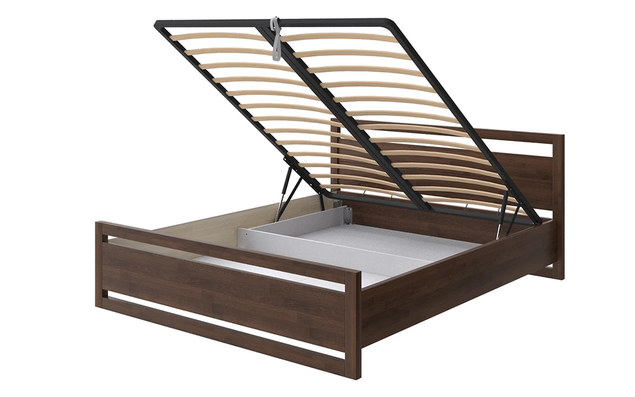 Кровать комплектуется металлическим основанием с подъемным механизмом. Надёжные газлифты обеспечивают лёгкое и плавное открытие, открывая вместительное пространство для хранения постельных принадлежностей. Механизм рассчитан на ежедневное использование и усиливает анатомические свойства матраса.